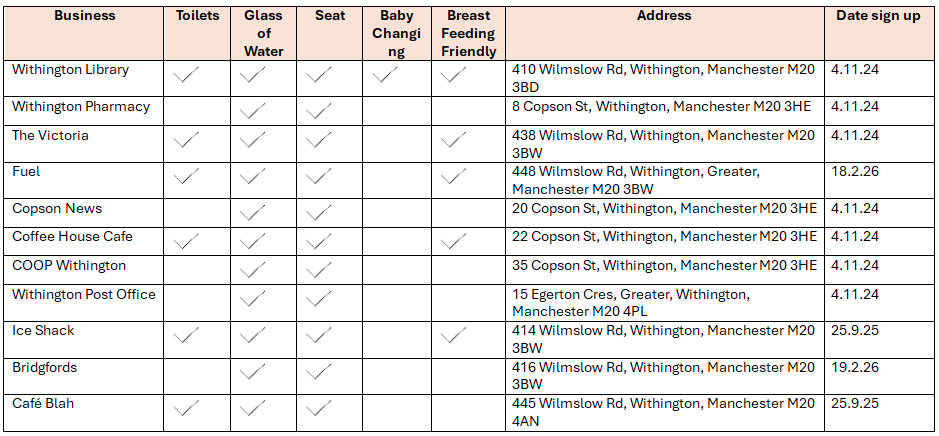 This scheme involves local businesses/community spaces offering use of one or all of the following: toilet facilities, use of a seat for a moment of rest, provision of a glass of tap water, baby changing facilities, a safe space to breastfeed your baby.