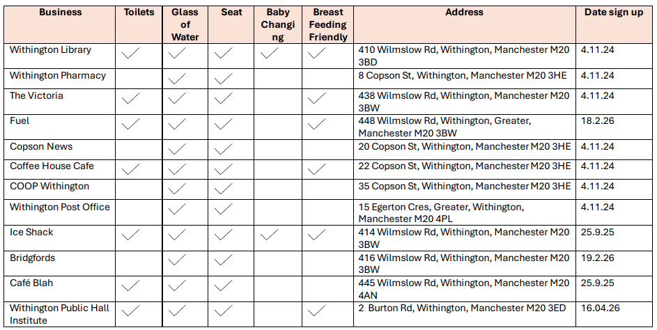 This scheme involves local businesses/community spaces offering use of one or all of the following: toilet facilities, use of a seat for a moment of rest, provision of a glass of tap water, baby changing facilities, a safe space to breastfeed your baby.