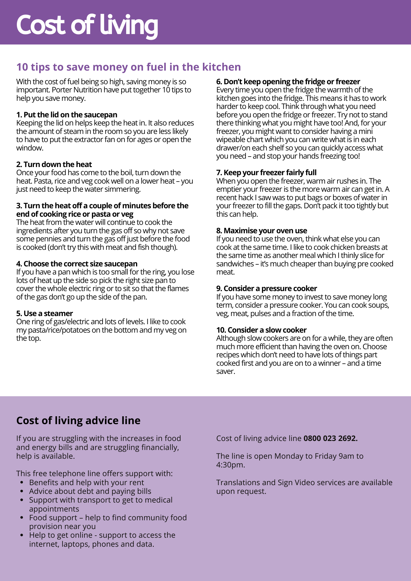 Cost of living advice line: 0800 023 2692